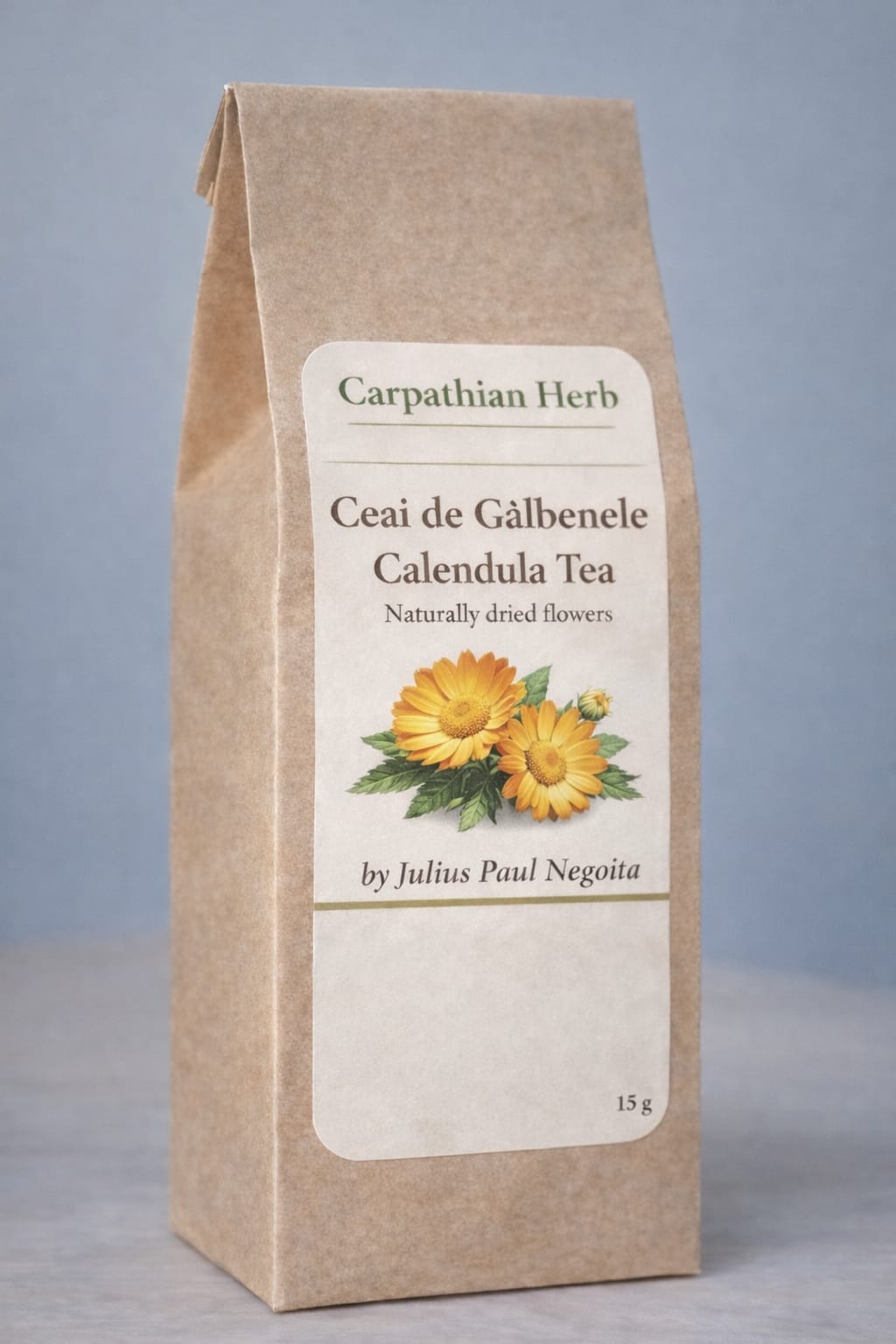 Carpathian Herb Calendula Tea is made exclusively from whole calendula flowers (petals), grown and hand-harvested in the Carpathian Curvature region of Romania.
